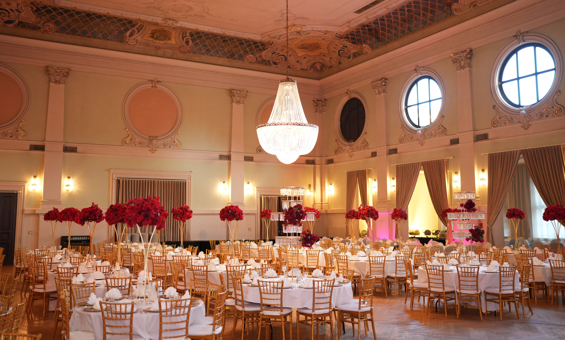 Unser prachtvoller, historischer Veranstaltungssaal bietet die perfekte Kulisse für Hochzeiten, Firmenfeiern und besondere Anlässe. Die einzigartige Atmosphäre verbindet zeitlose Eleganz mit moderner Eventtechnik und schafft den idealen Rahmen für Ihr Event.